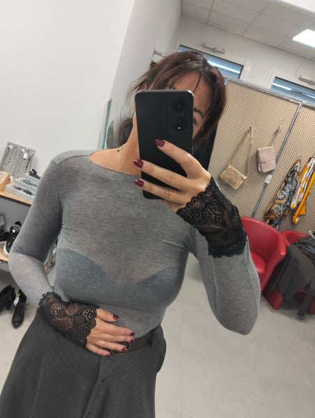 Maglia collo a barca in cashmere con dettagli pizzo sulla manica e in fondo