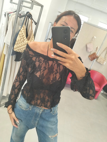 Maglia con scollo barca- laccino davanti e sui polsini